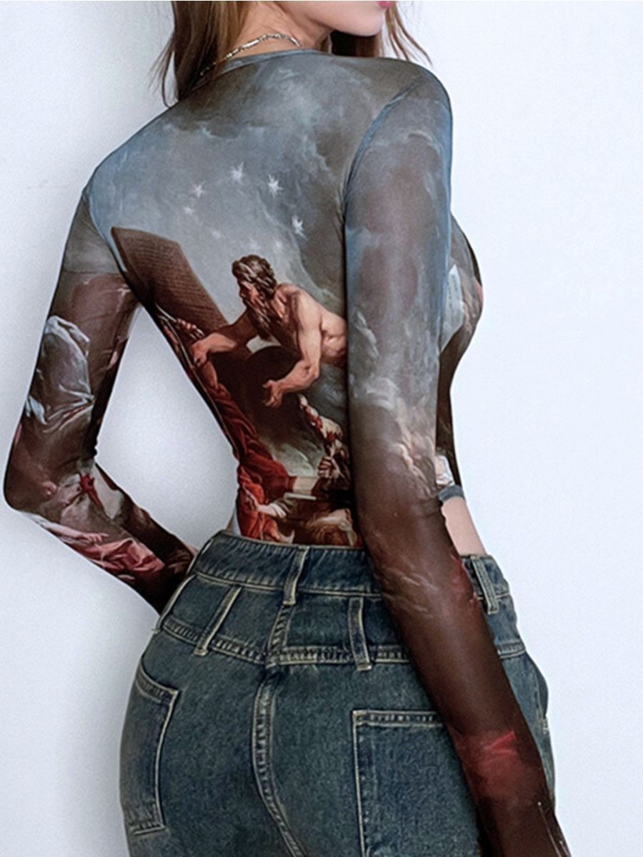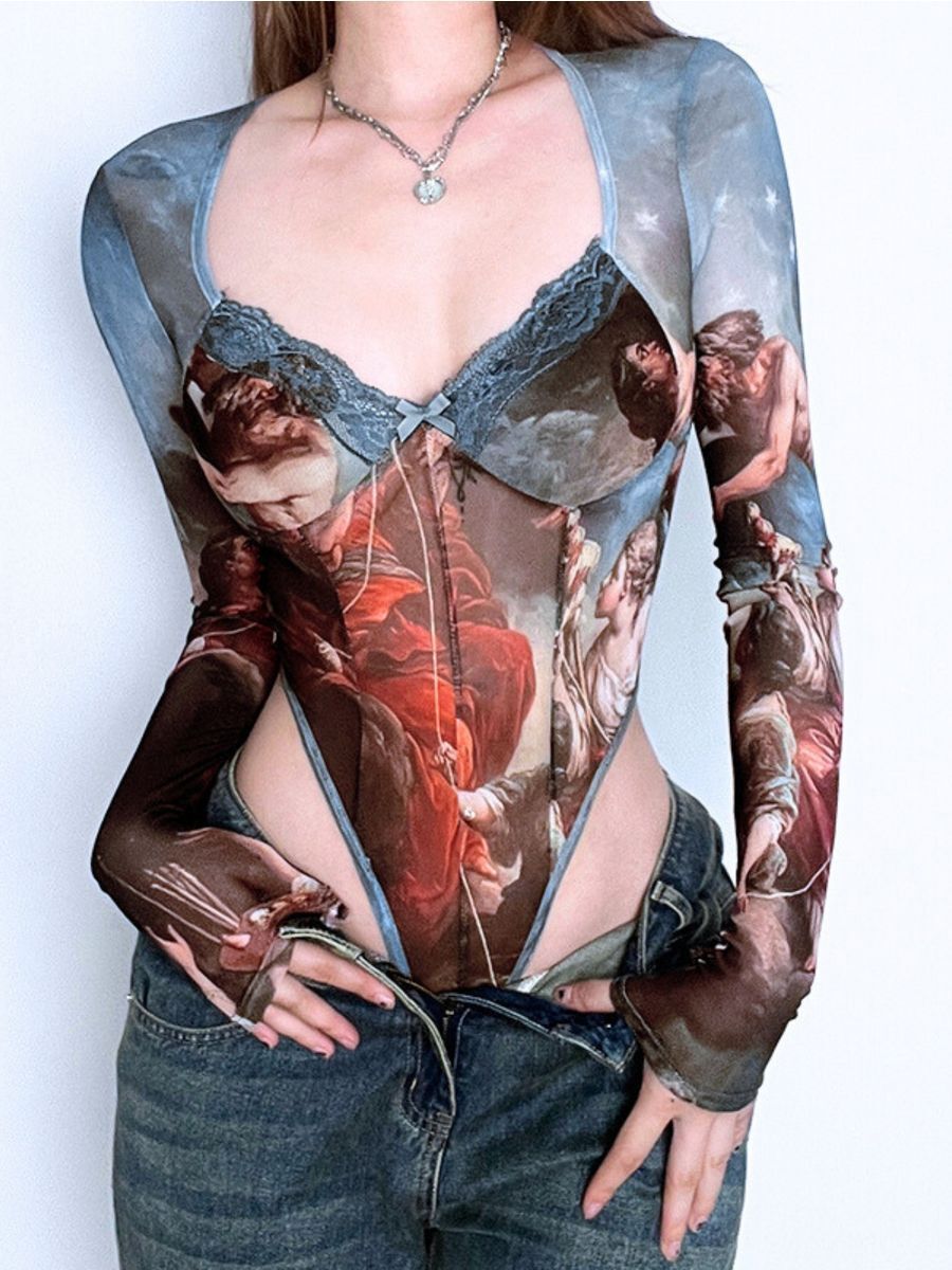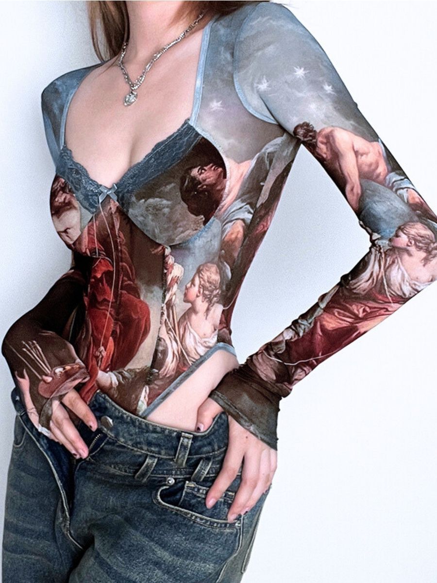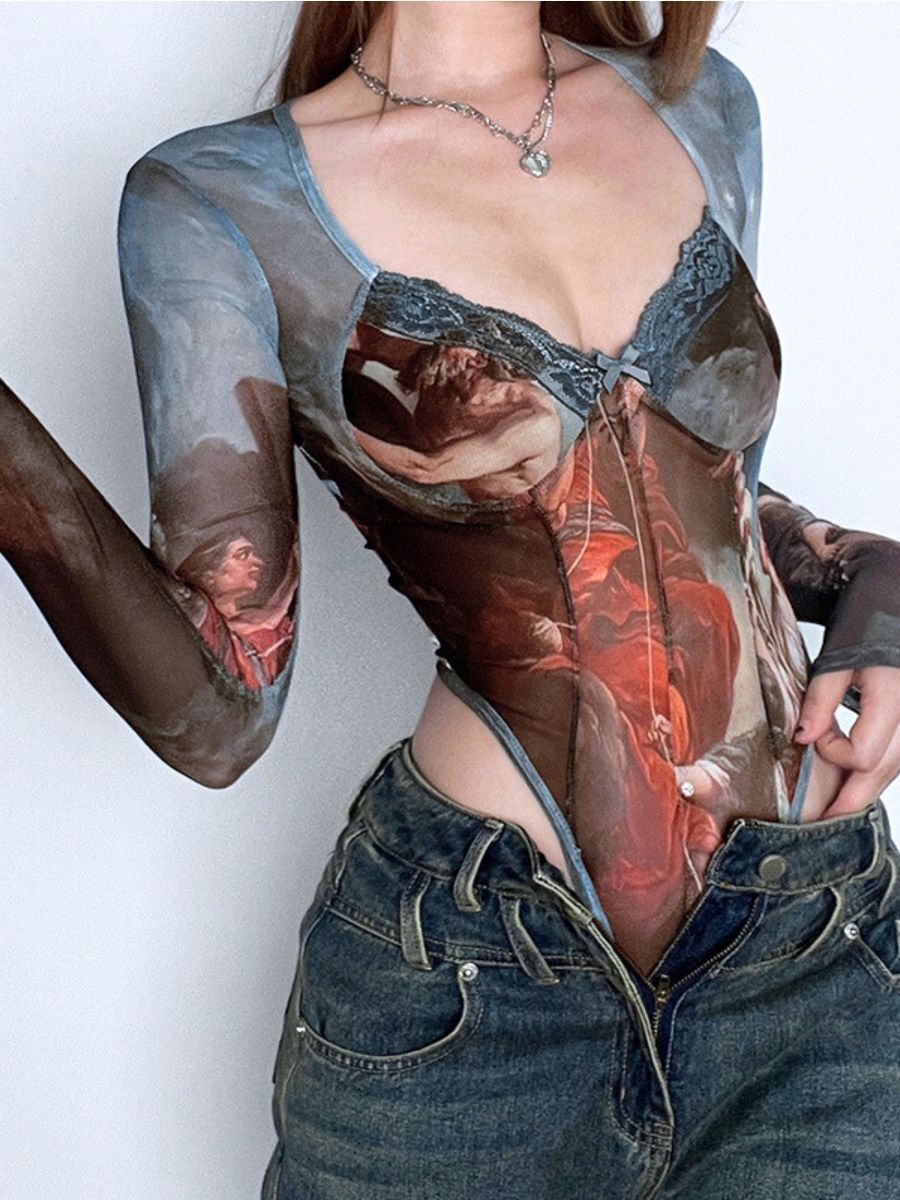 Боди с квадратным вырезом на груди и ярким принтом - тренд 2024.