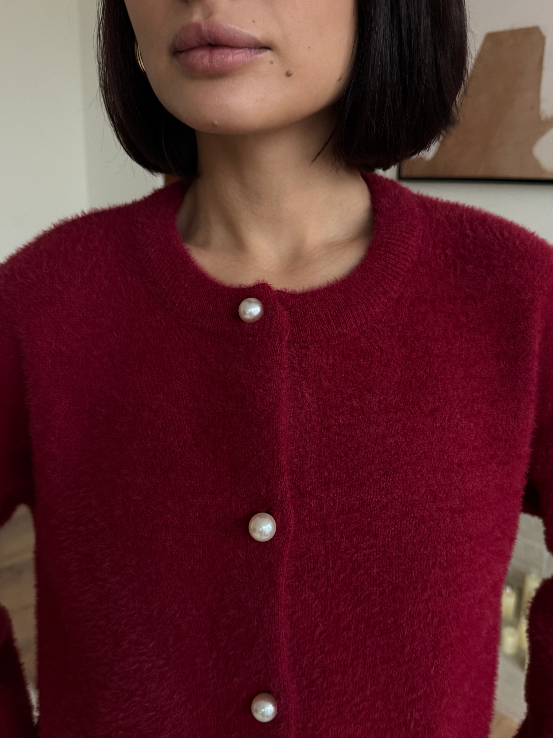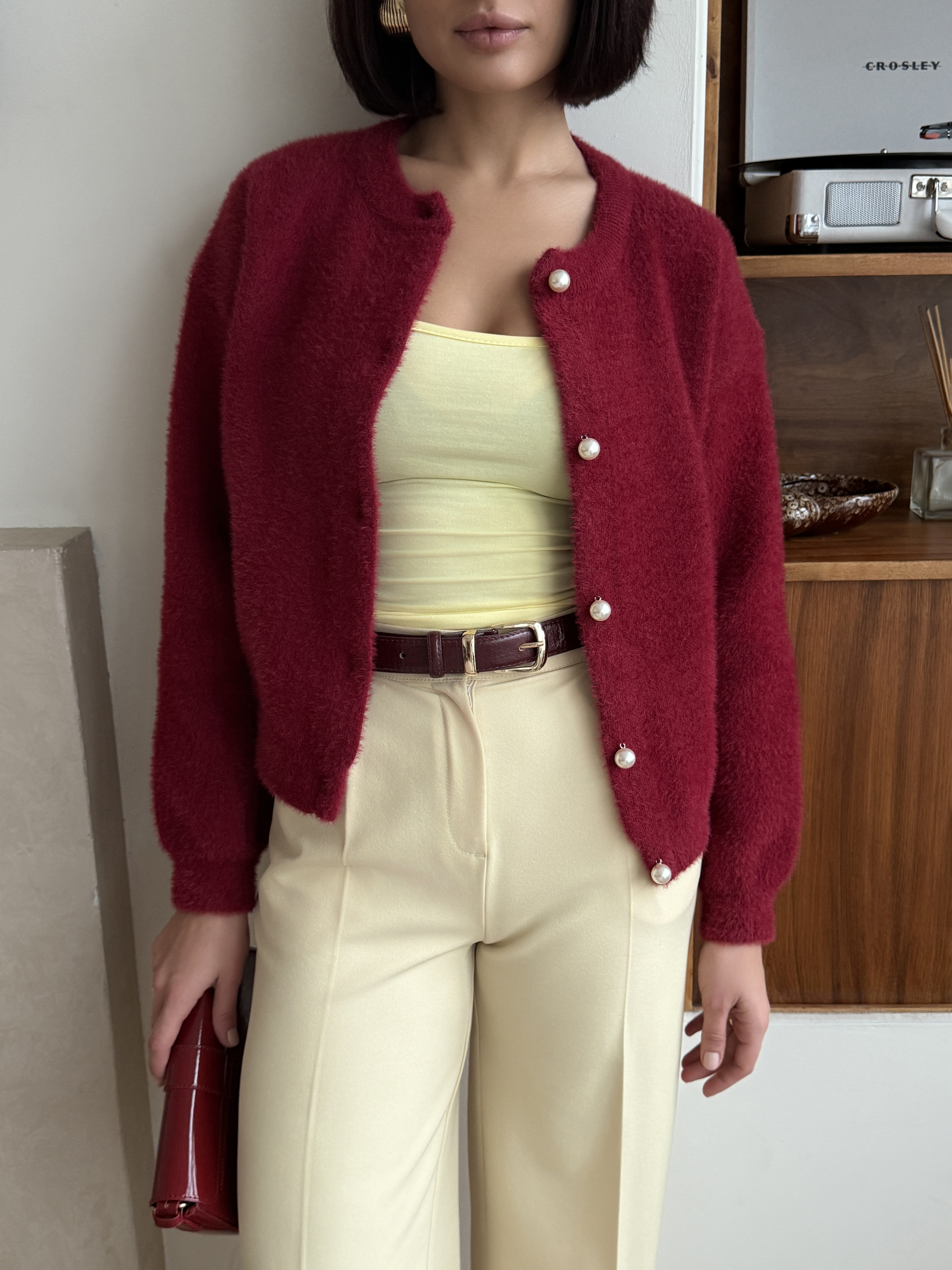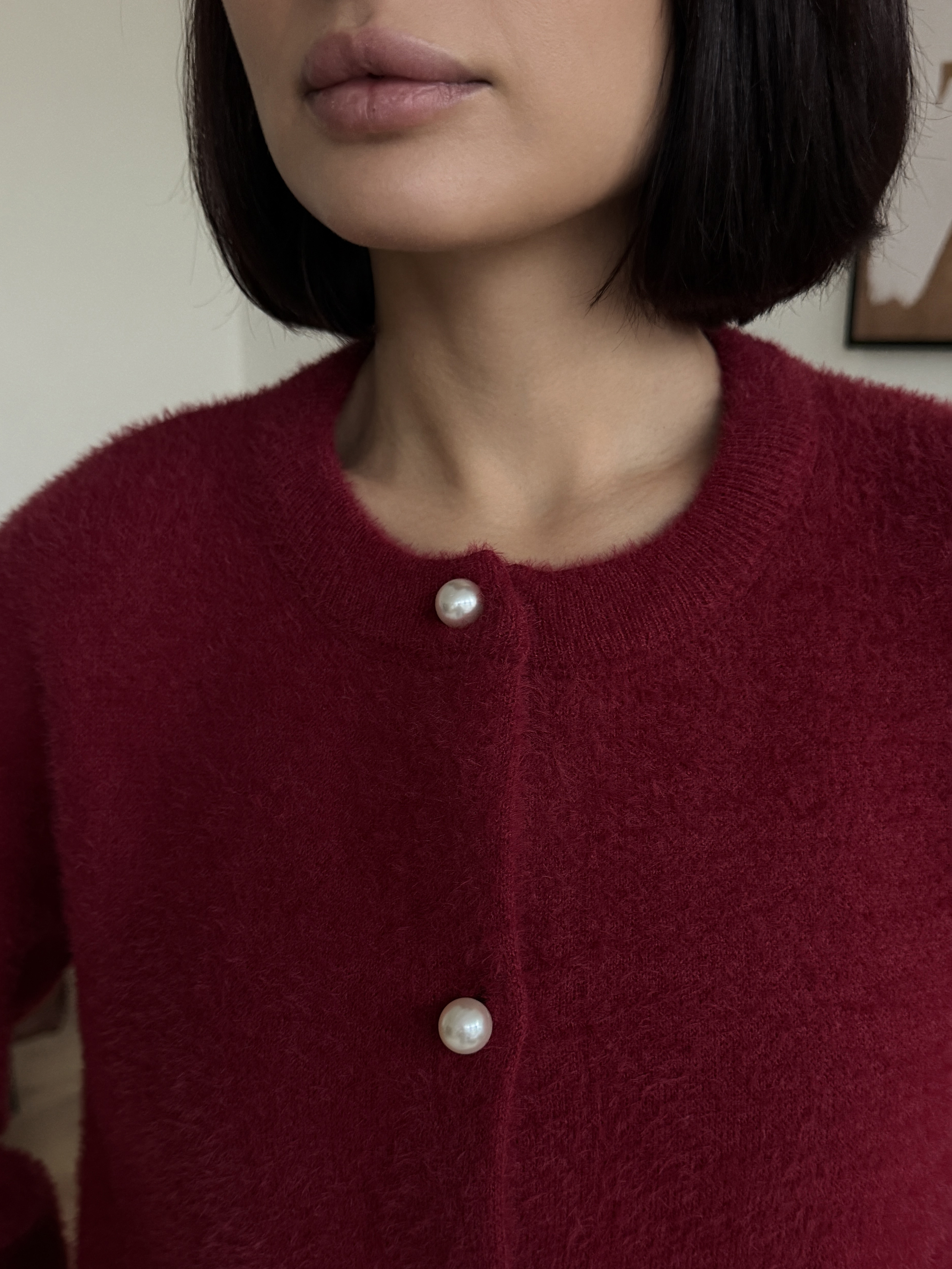 Выбирете свой размер и наслаждайтесь нежным облаком пушистой пряжи. Этот элегантный шерстяной кардиган бордового цвета привнесет в ваш зимний гардероб трендовую изысканность 2026 года и станет вашим самым любимым спутником холодов.