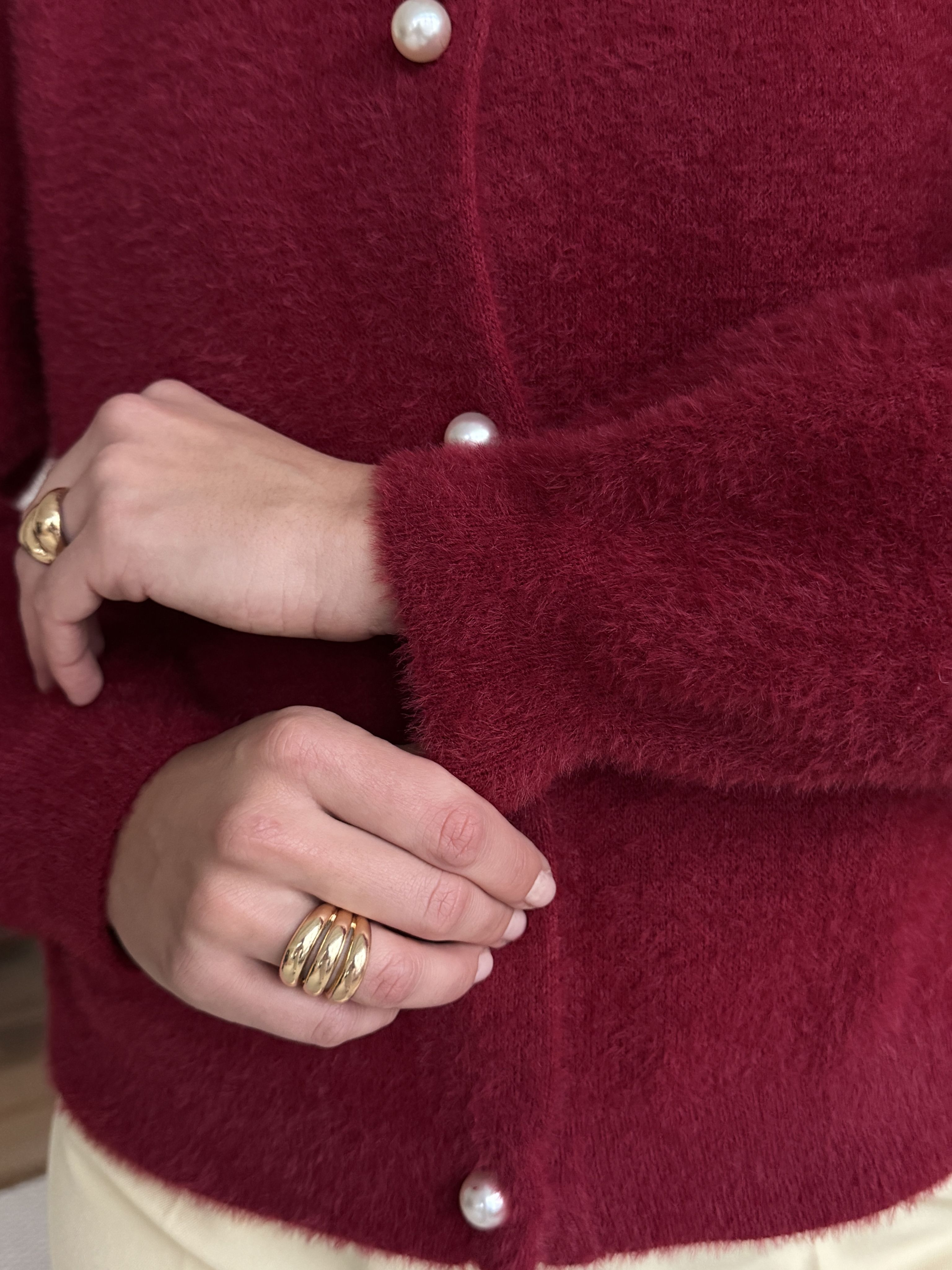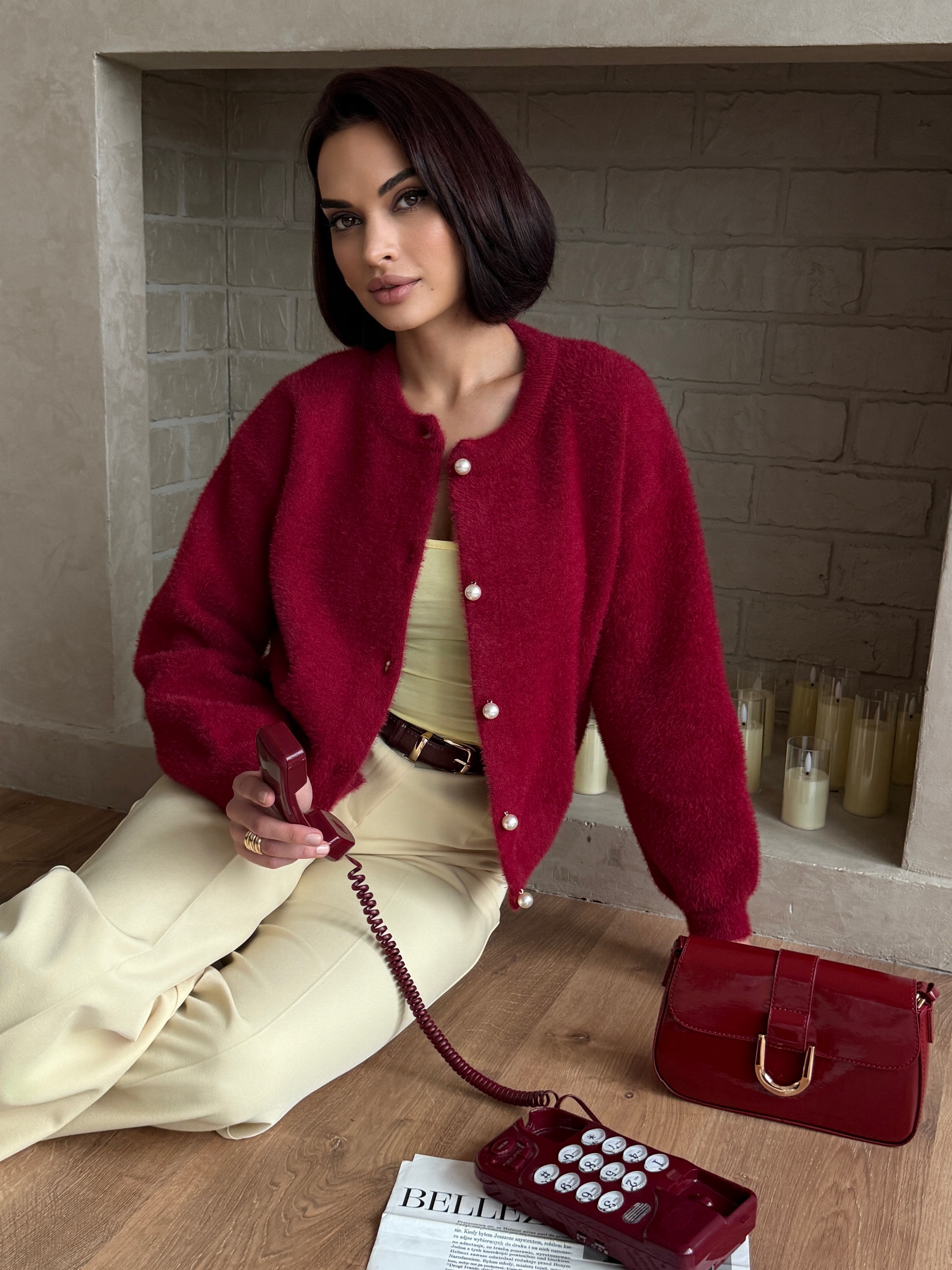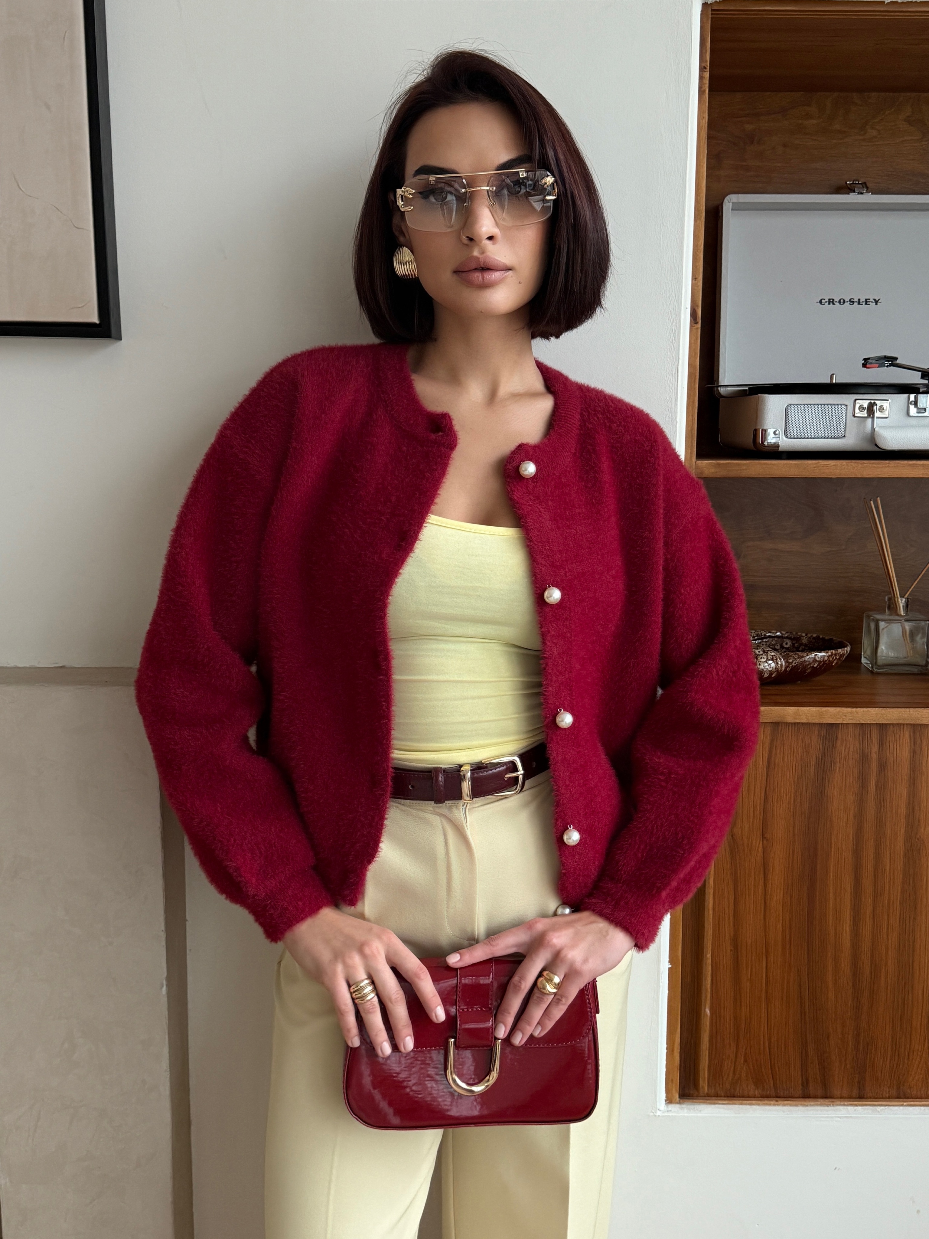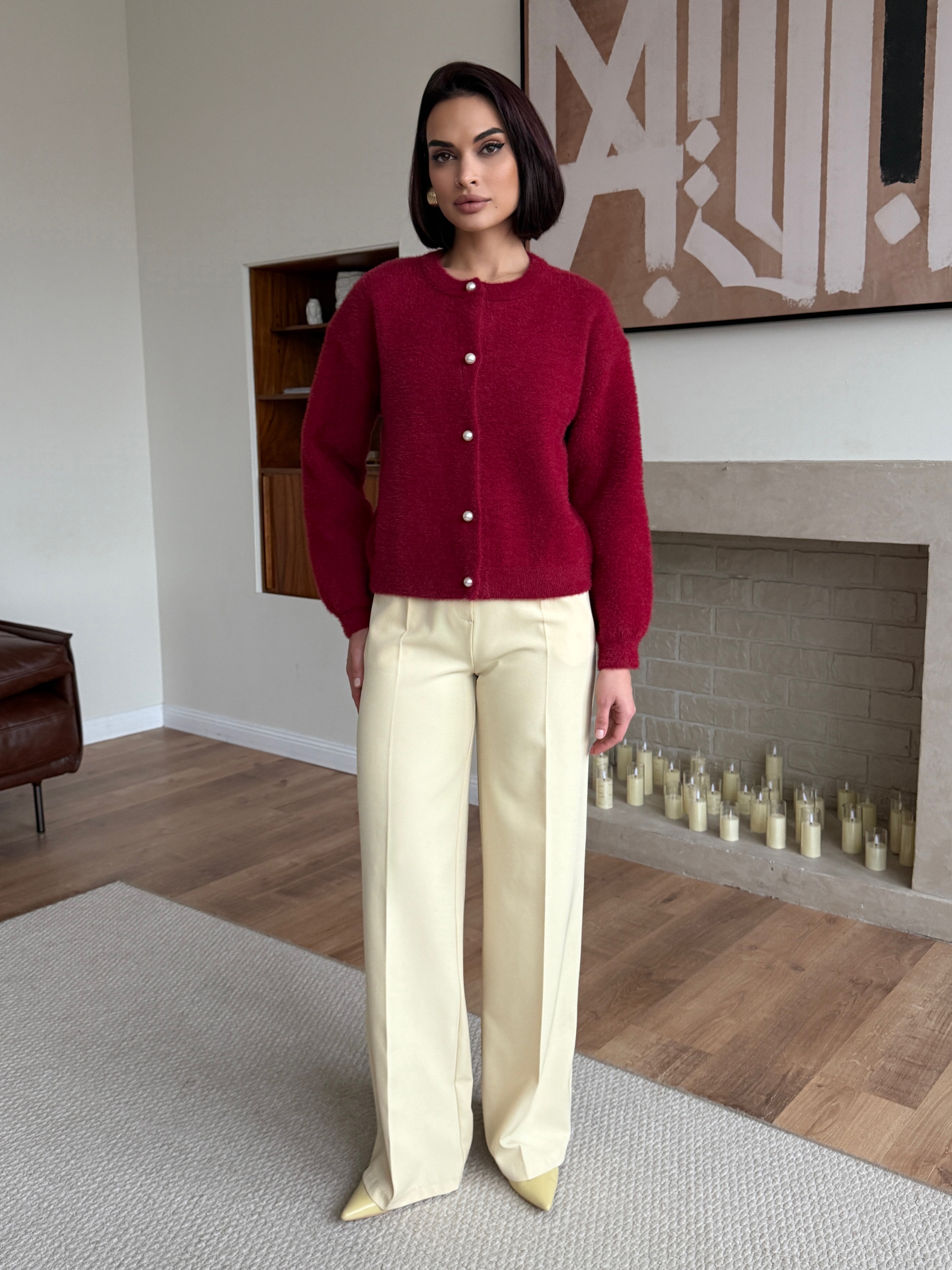 Выбирете свой размер и наслаждайтесь нежным облаком пушистой пряжи. Этот элегантный шерстяной кардиган бордового цвета привнесет в ваш зимний гардероб трендовую изысканность 2026 года и станет вашим самым любимым спутником холодов.