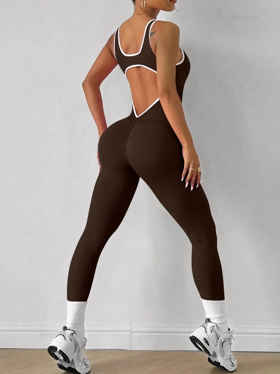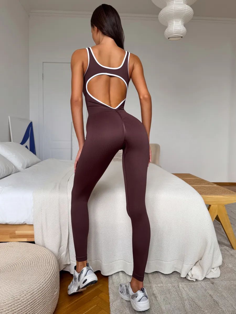 Фитнес комбинезон имеет открытую спину, что делает образ женственным и современным. Специальный дизайн с эффектом push-up сзади подчеркивает ягодицы, создавая привлекательный акцент. Такой спортивный костюм подчеркивает достоинства фигуры и не сковывает движений, позволяя наслаждаться тренировками в полной мере.