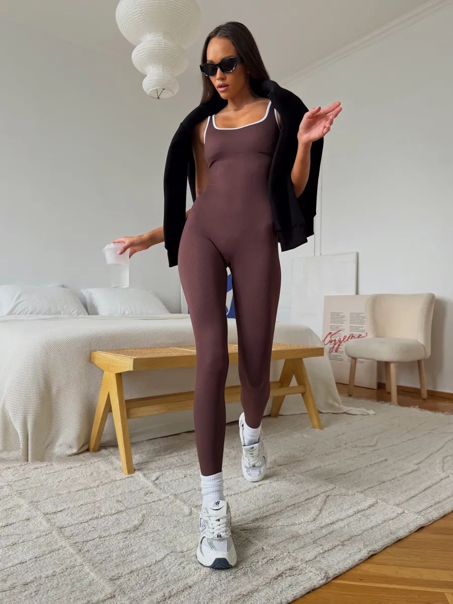 Главная особенность модели – шикарный коричневый комбинезон с белой отстрочкой, который выглядит стильно и элегантно. Контрастная отделка добавляет выразительности, а благородный цвет легко сочетается с любым спортивным гардеробом и подчеркивает вашу индивидуальность.