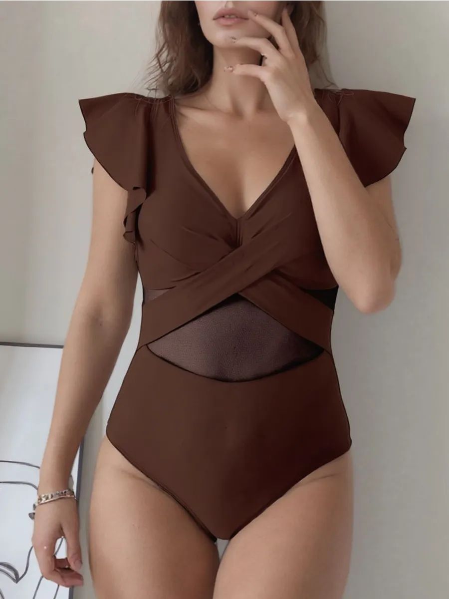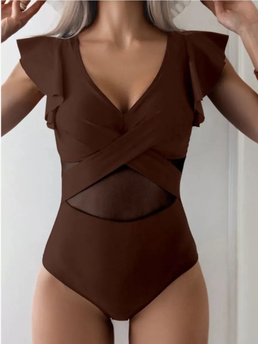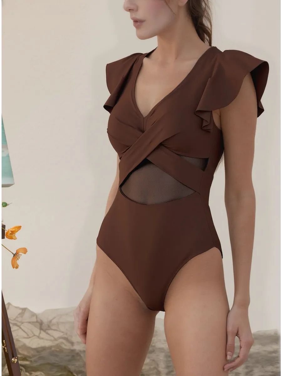 Купальник выполнен в трендовом коричневом цвете с женственными вставками из сетки. Закрытый дизайн позволяет корректировать силуэт, обеспечивая отличную посадку на теле.
