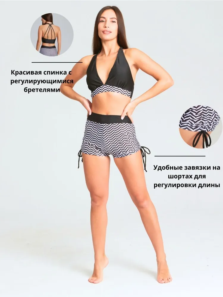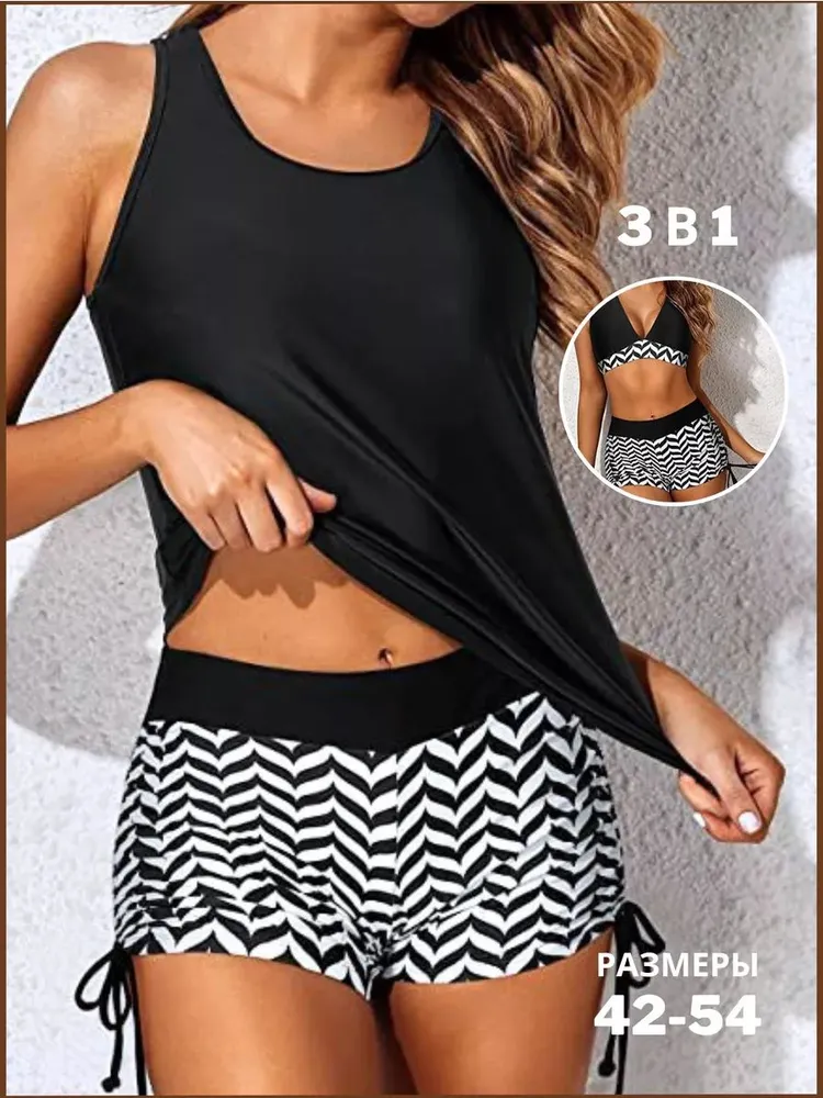 Представляем вам купальник танкини с шортами и топом 3в1 раздельного дизайна. Это идеальный выбор для активного отдыха на пляже или в бассейне. Он сочетает в себе стиль, комфорт и функциональность. Танкини представляет собой модель, состоящую из топа и шорт, которые могут быть надеты отдельно или вместе. Также в комплекте майка, вы можете носить плавательный костюм с ней или без нее. Такой раздельный дизайн позволяет женщине создать свой индивидуальный образ, выбрав наиболее подходящий размер и посадку для своей фигуры. Топ сделан из высококачественного материала, который обеспечивает полную поддержку груди и позволяет чувствовать себя комфортно во время плавания или занятий спортом.