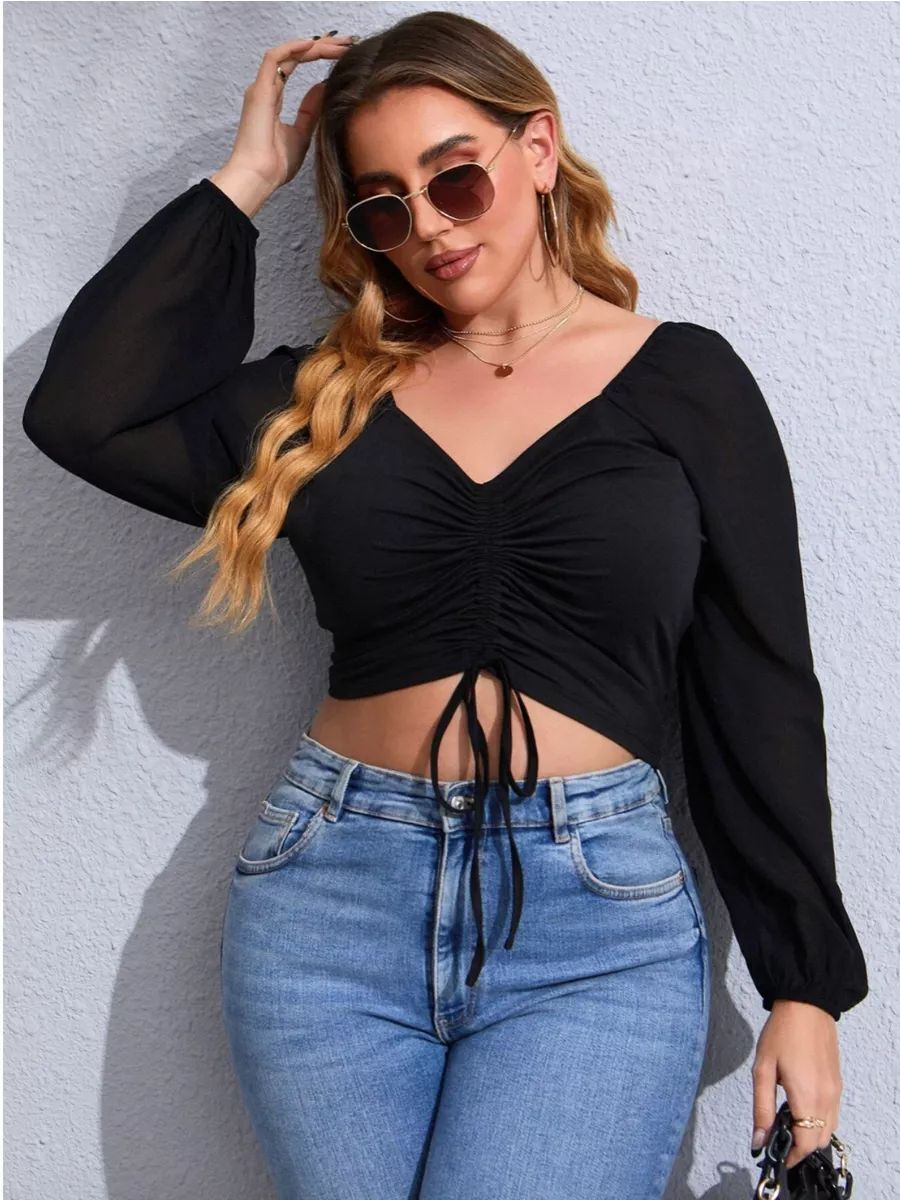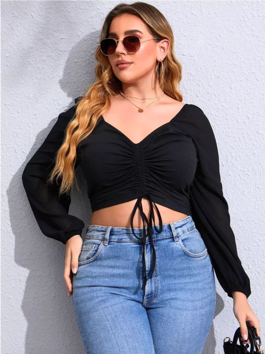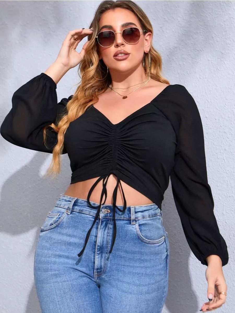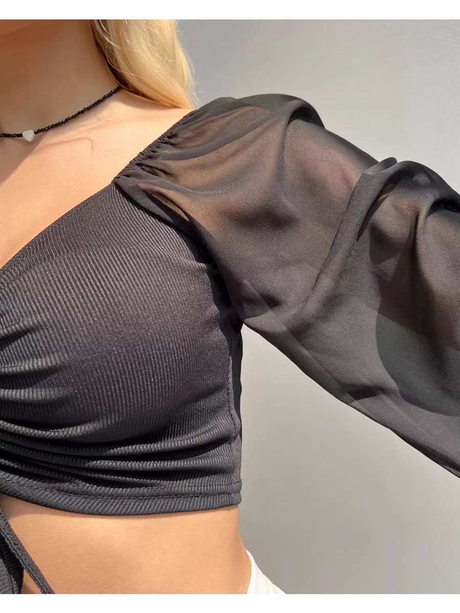 Топ с длинным рукавом - это классическая элегантность. Черный цвет стройнит и подходит для различных мероприятий. Милый топ с завязками можно регулировать по длине. Нарядный легкий топ подчеркивает изящество вашего декольте.